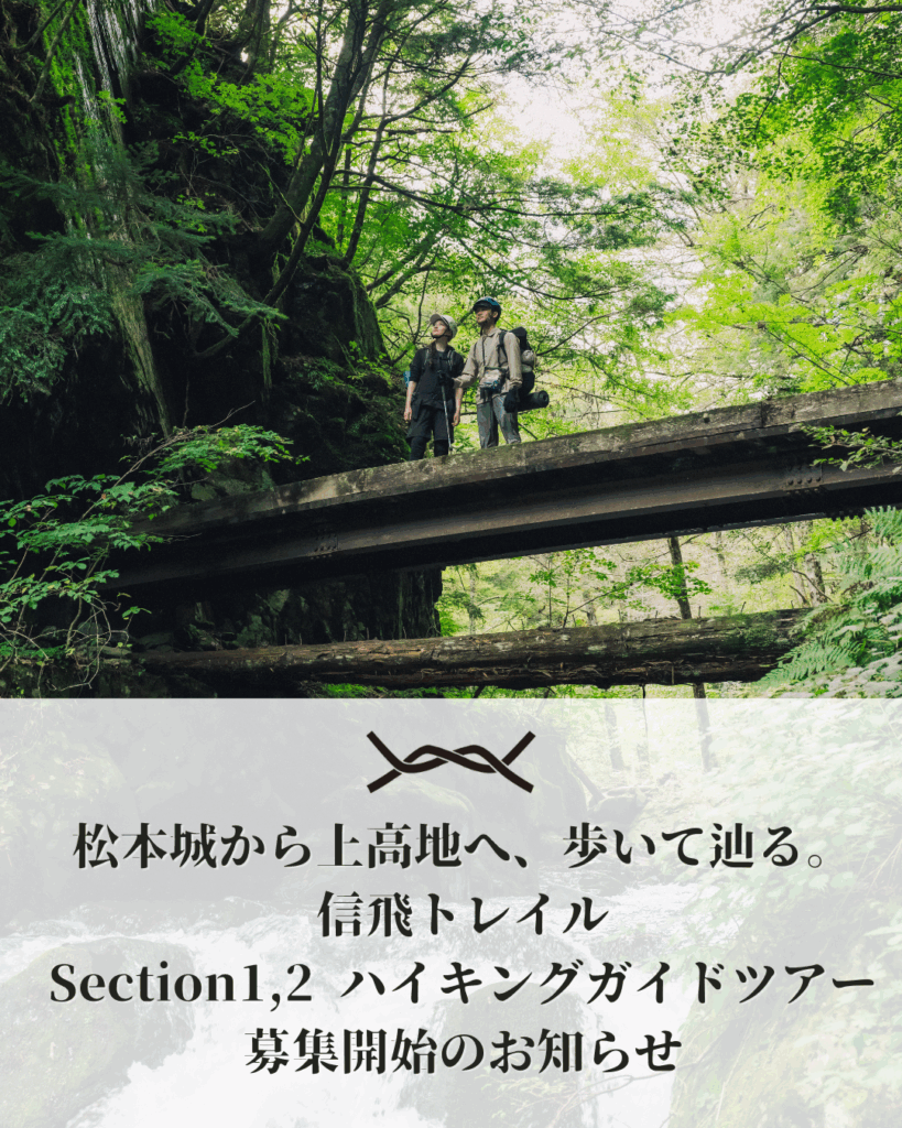 信飛トレイルの松本側であるSection1とSection2を、ガイドとともに一泊二日で歩く特別なツアーを開催します。松本城太鼓門を起点に、古道の面影を残す島々谷を経て、北アルプスの玄関口・上高地へと至る道のりをたどります。